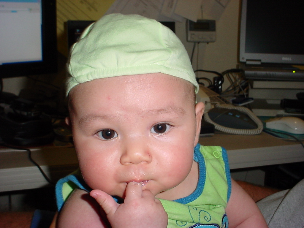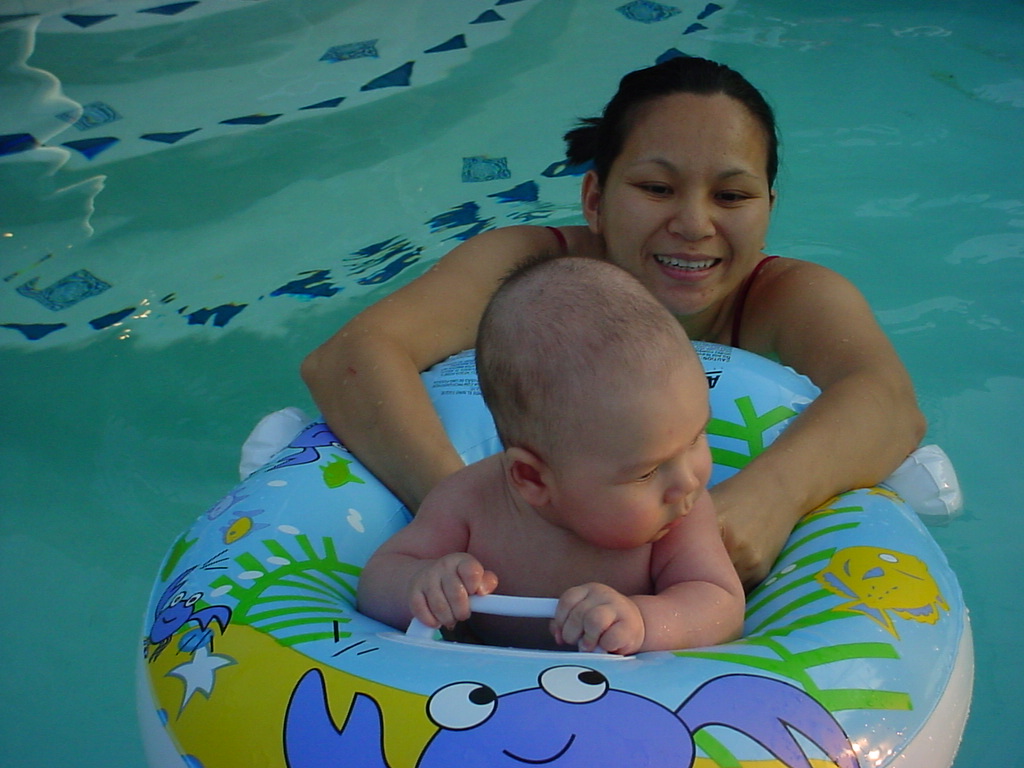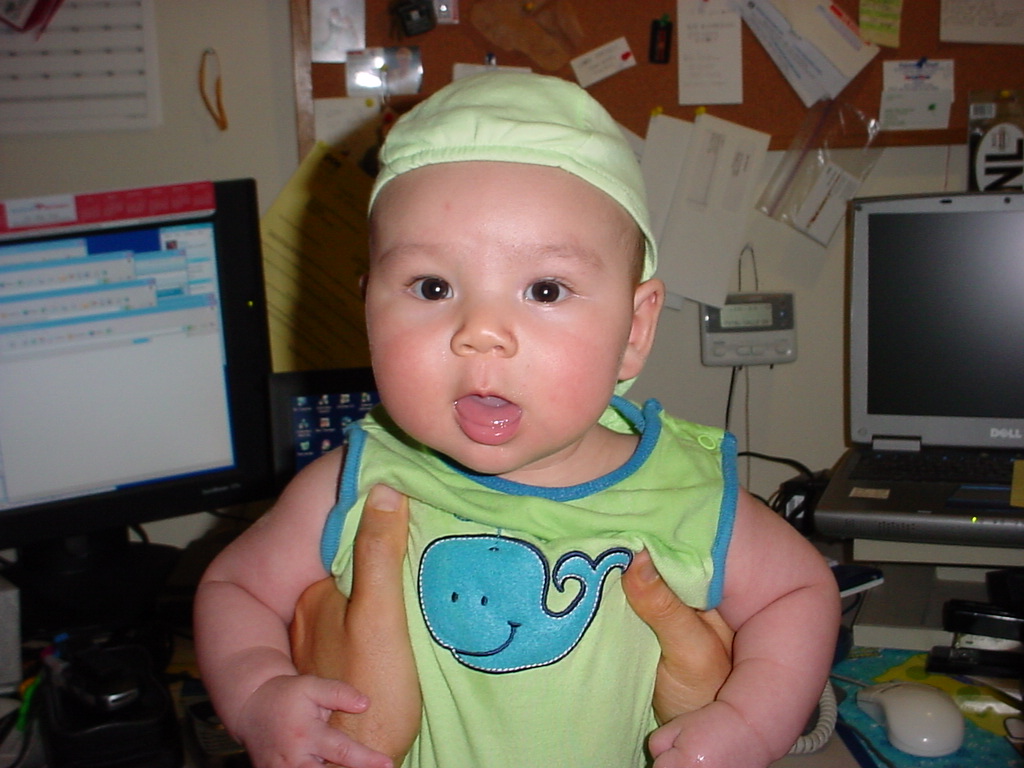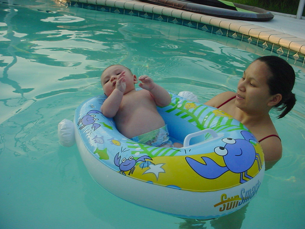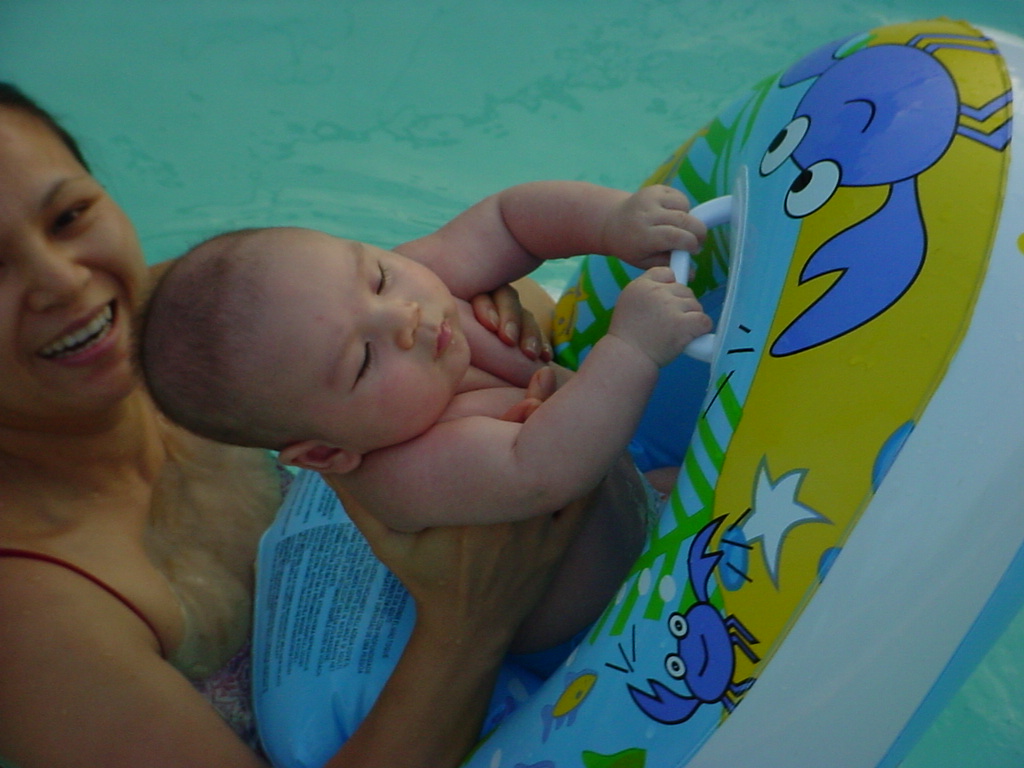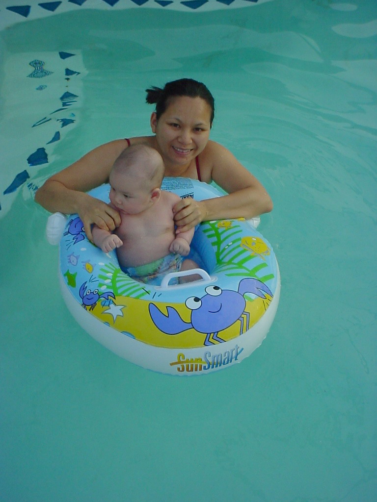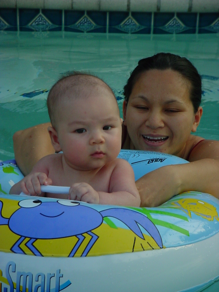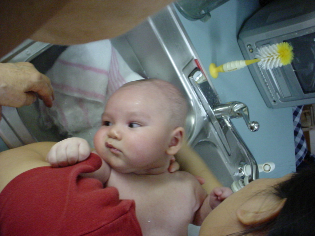 Mommy's Note (September 23, 2005): It has been a great change of pace to be home with Brit full time. In just the past two weeks, we noticed quite a few developmental changes in him. He has been drooling a lot and biting on everything he can fit into his mouth. He started rolling over from his back to his stomach. I also noticed he is starting to recognize me and starts to look for me when I'm out of sight. Brit has been an awesome baby so far. He is now sleeping through the night, more or less (he sleeps for 8-12 hours but is not consistent yet). We really enjoy the little guy and his many, many changes. Let's hope he stays nice and sweet for the trip out to California next month. His gung-gung and popo are excited to see the little guy again. They have not seen him since he was a month old. Once again, we had a good visit at his well baby check-up. Brit is growing at a good clip (ranking in the 90th plus percentiles for height and weight). But he is not the biggest baby around town. We started attending a mom's luncheon every Tuesday at Manatee Memorial Hospital where he was born. There are some big babies in that group. Brit enjoys hanging out with his buddies. His mommy likes to talk to other new mommies. The mom's luncheon is a great place to meet other first time moms and compare notes.