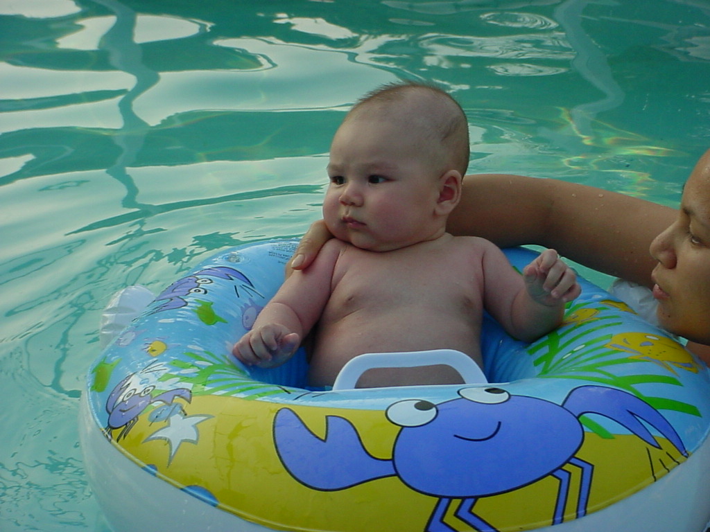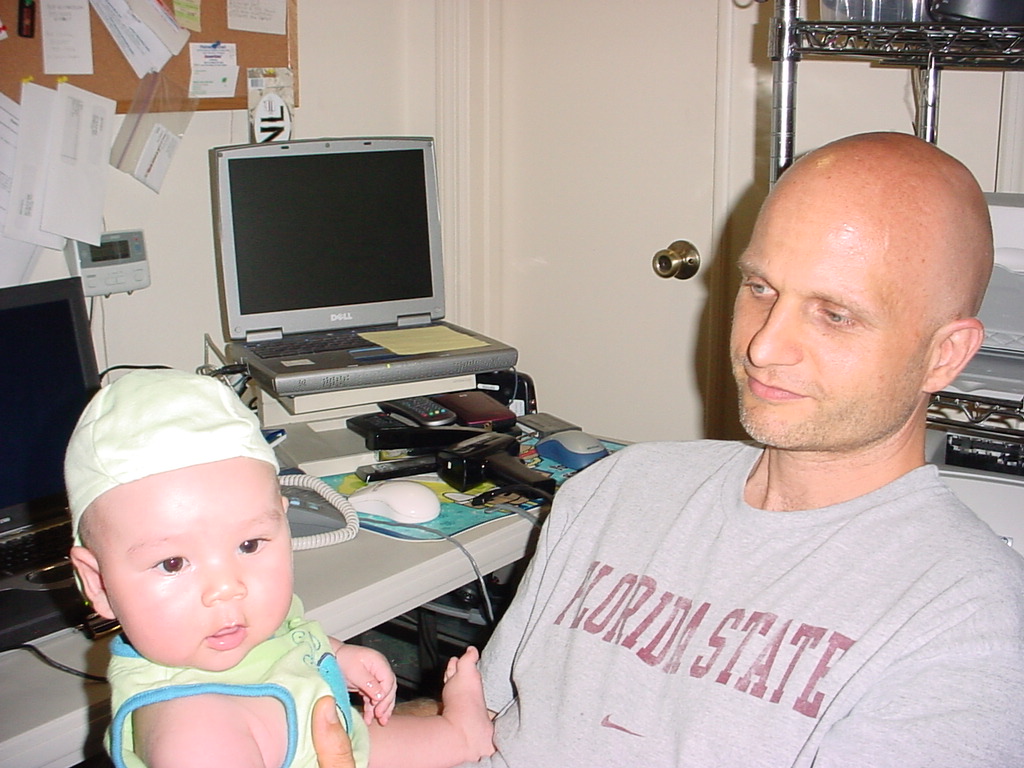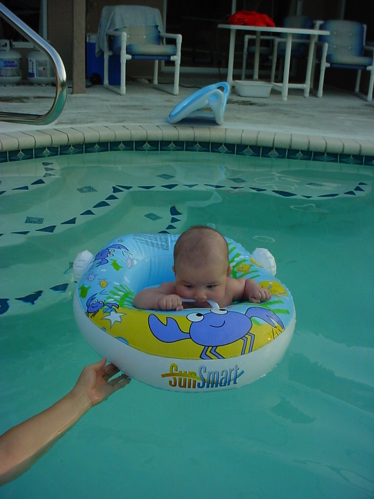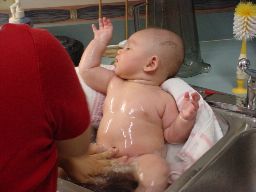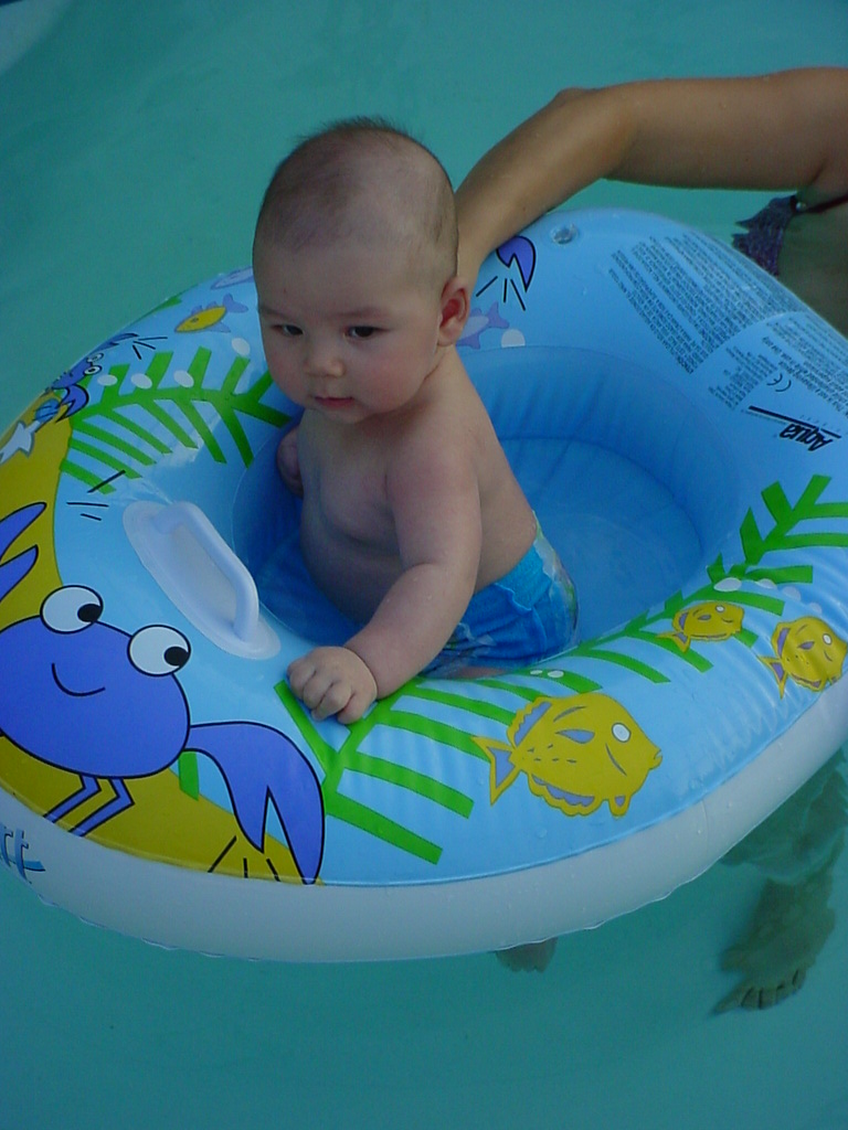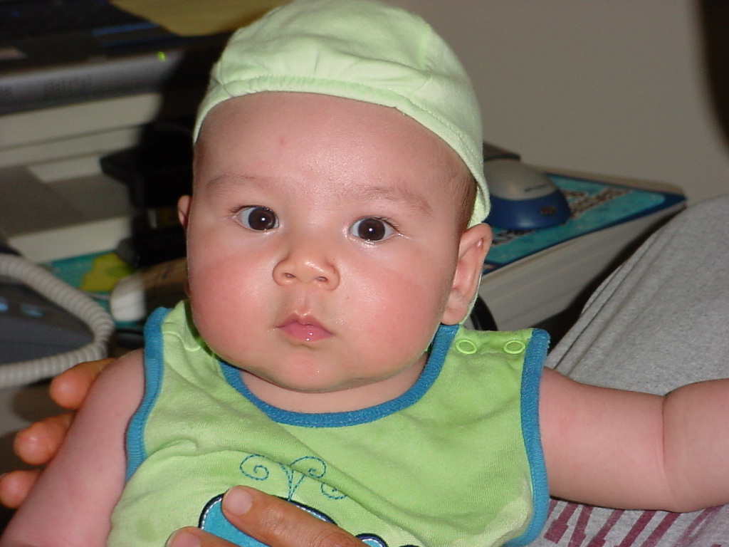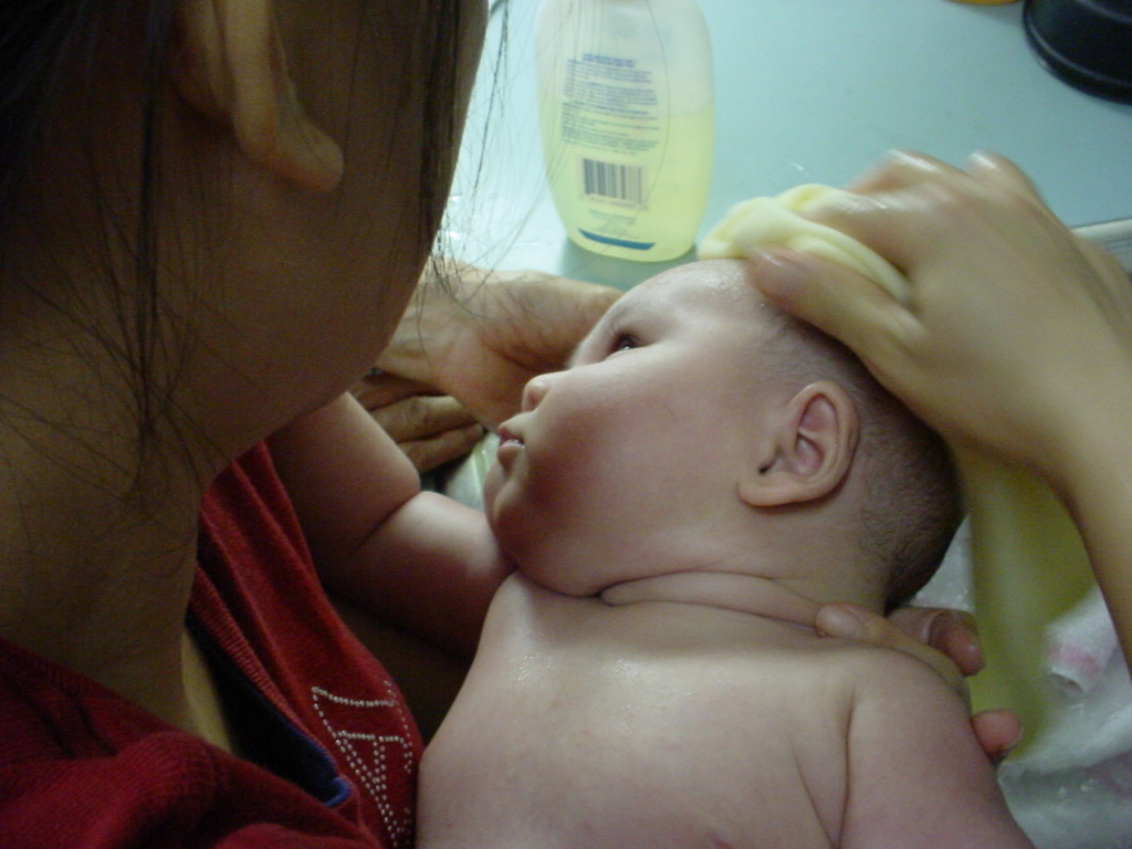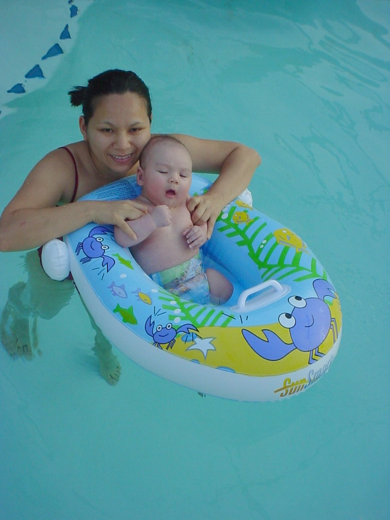 Mommy's Note (September 23, 2005): It has been a great change of pace to be home with Brit full time. In just the past two weeks, we noticed quite a few developmental changes in him. He has been drooling a lot and biting on everything he can fit into his mouth. He started rolling over from his back to his stomach. I also noticed he is starting to recognize me and starts to look for me when I'm out of sight. Brit has been an awesome baby so far. He is now sleeping through the night, more or less (he sleeps for 8-12 hours but is not consistent yet). We really enjoy the little guy and his many, many changes. Let's hope he stays nice and sweet for the trip out to California next month. His gung-gung and popo are excited to see the little guy again. They have not seen him since he was a month old. Once again, we had a good visit at his well baby check-up. Brit is growing at a good clip (ranking in the 90th plus percentiles for height and weight). But he is not the biggest baby around town. We started attending a mom's luncheon every Tuesday at Manatee Memorial Hospital where he was born. There are some big babies in that group. Brit enjoys hanging out with his buddies. His mommy likes to talk to other new mommies. The mom's luncheon is a great place to meet other first time moms and compare notes.
