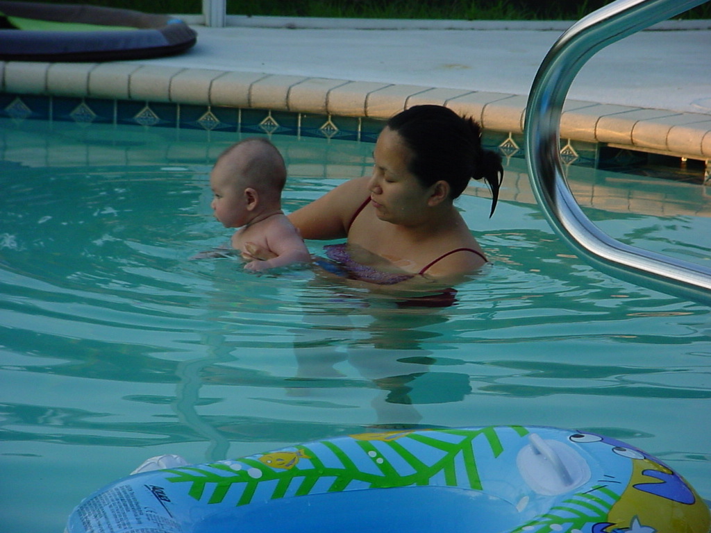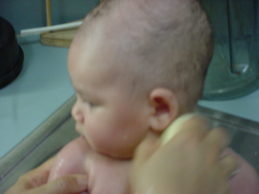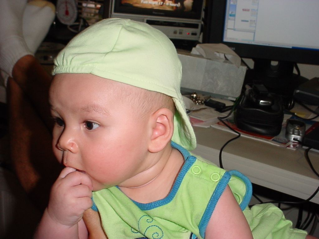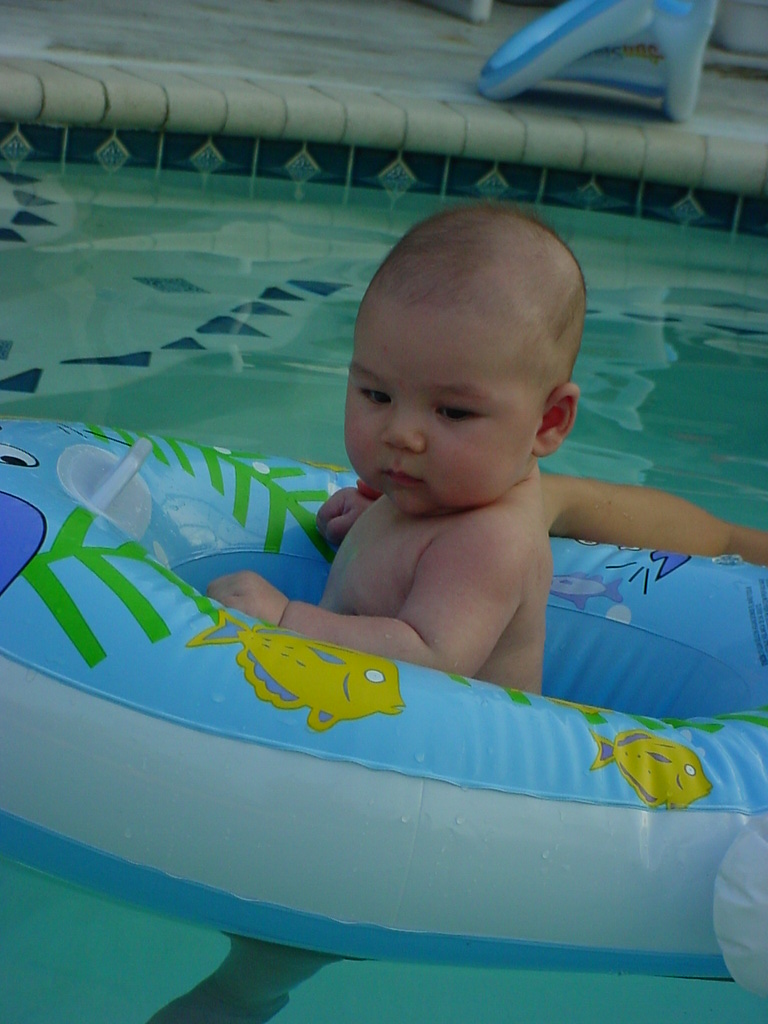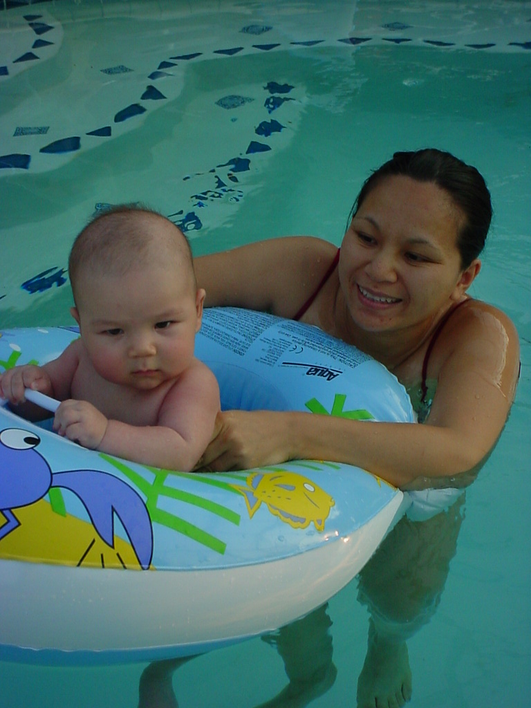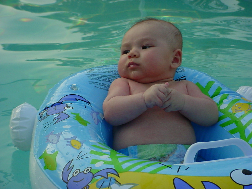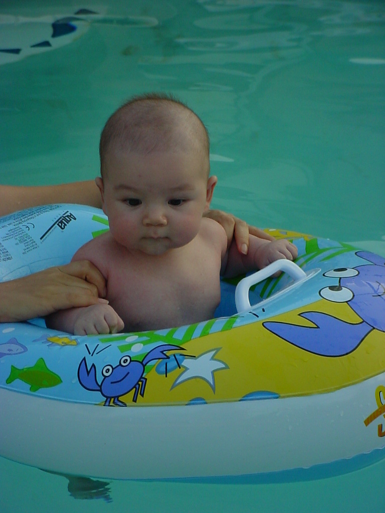 Mommy's Note (September 23, 2005): It has been a great change of pace to be home with Brit full time. In just the past two weeks, we noticed quite a few developmental changes in him. He has been drooling a lot and biting on everything he can fit into his mouth. He started rolling over from his back to his stomach. I also noticed he is starting to recognize me and starts to look for me when I'm out of sight. Brit has been an awesome baby so far. He is now sleeping through the night, more or less (he sleeps for 8-12 hours but is not consistent yet). We really enjoy the little guy and his many, many changes. Let's hope he stays nice and sweet for the trip out to California next month. His gung-gung and popo are excited to see the little guy again. They have not seen him since he was a month old. Once again, we had a good visit at his well baby check-up. Brit is growing at a good clip (ranking in the 90th plus percentiles for height and weight). But he is not the biggest baby around town. We started attending a mom's luncheon every Tuesday at Manatee Memorial Hospital where he was born. There are some big babies in that group. Brit enjoys hanging out with his buddies. His mommy likes to talk to other new mommies. The mom's luncheon is a great place to meet other first time moms and compare notes.
