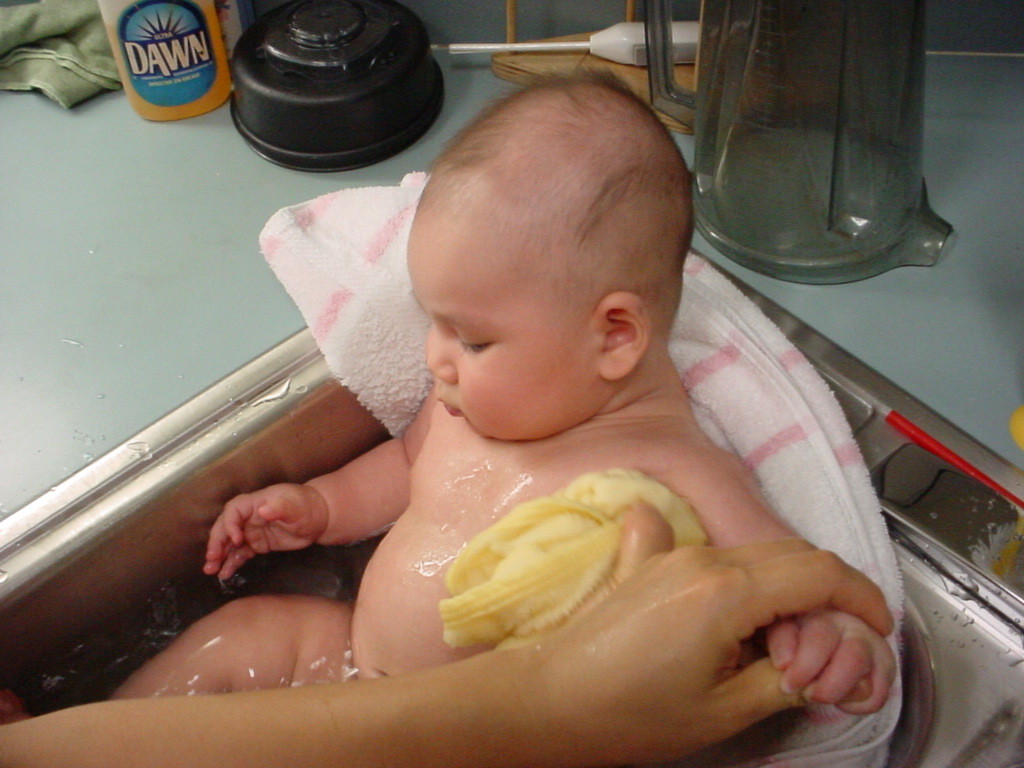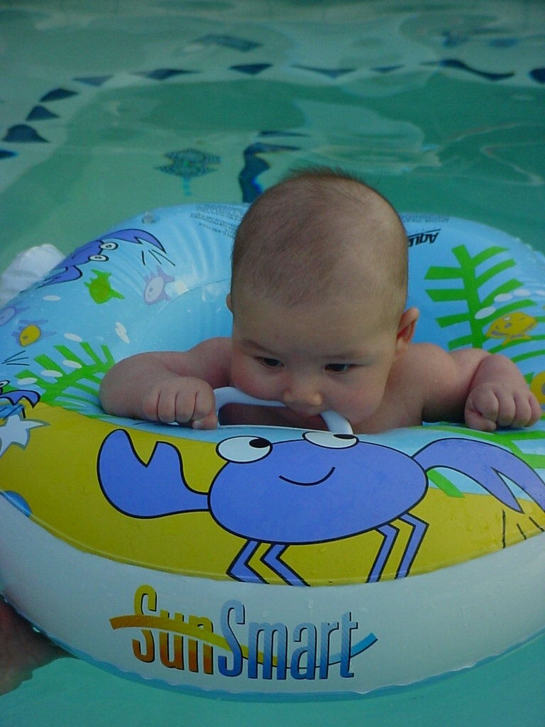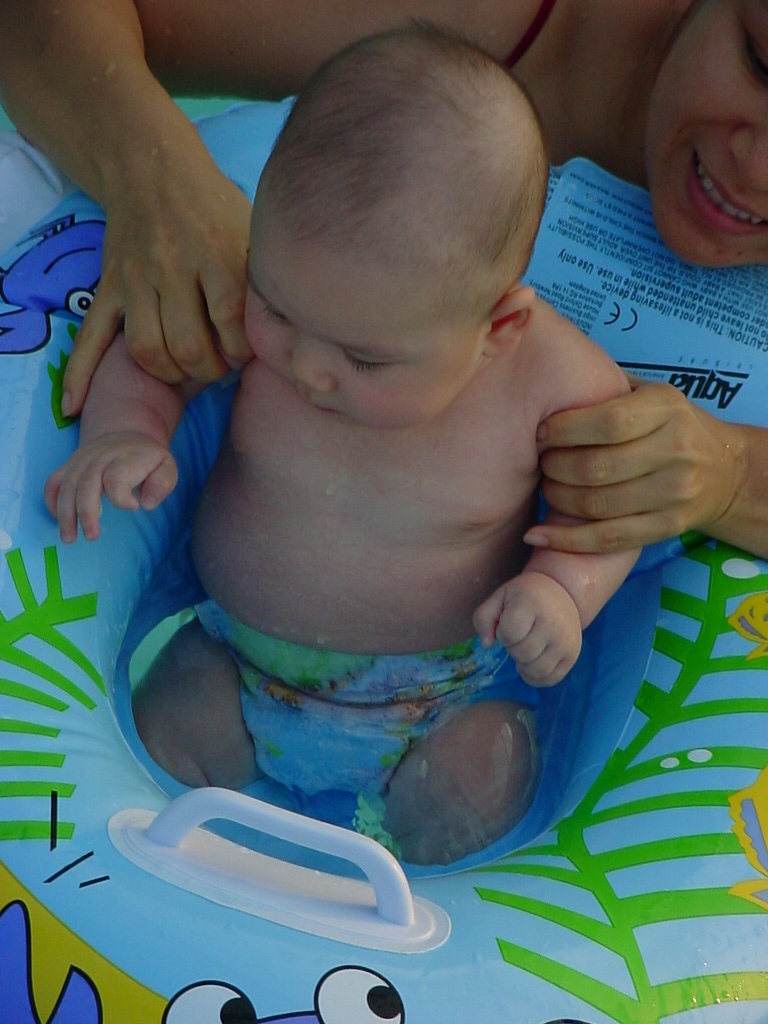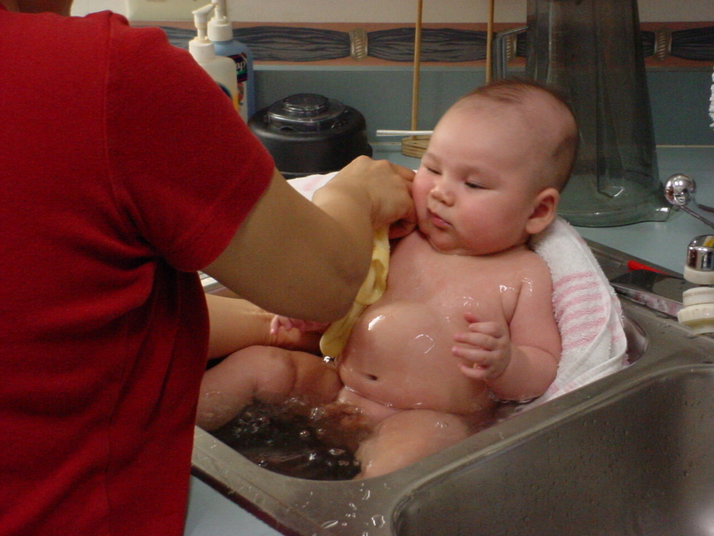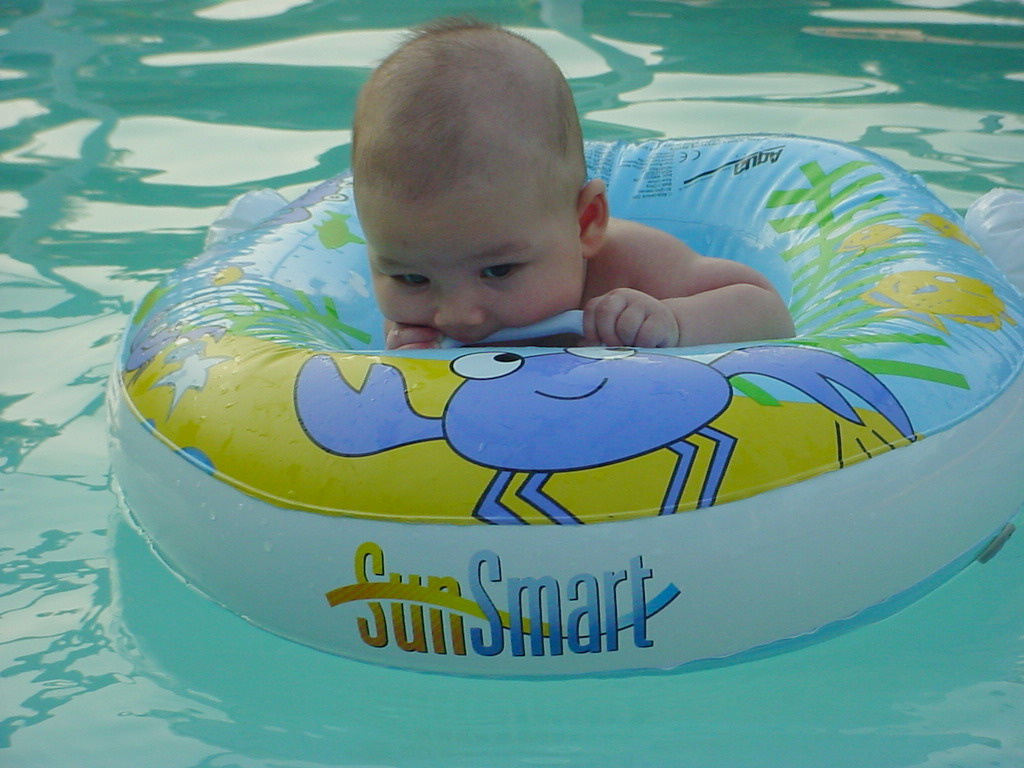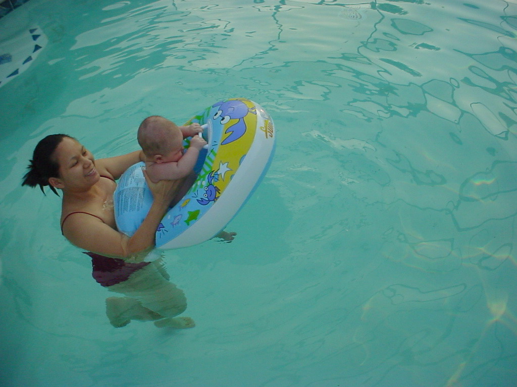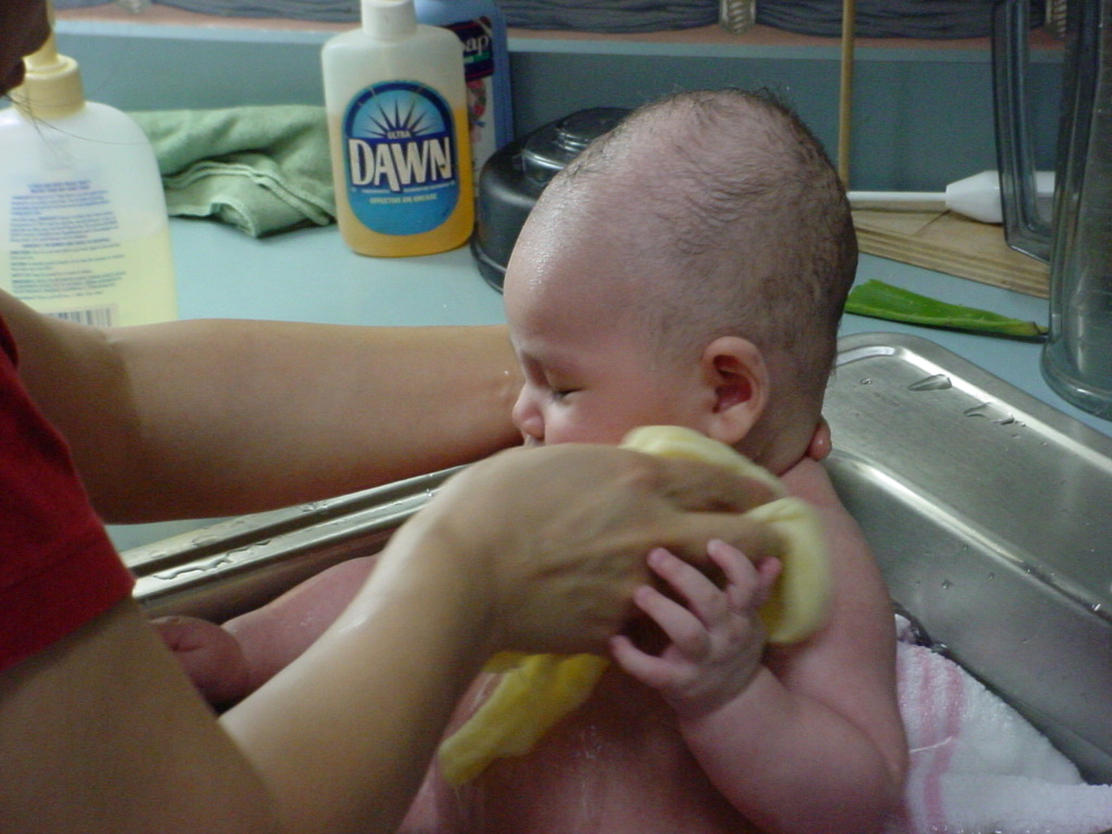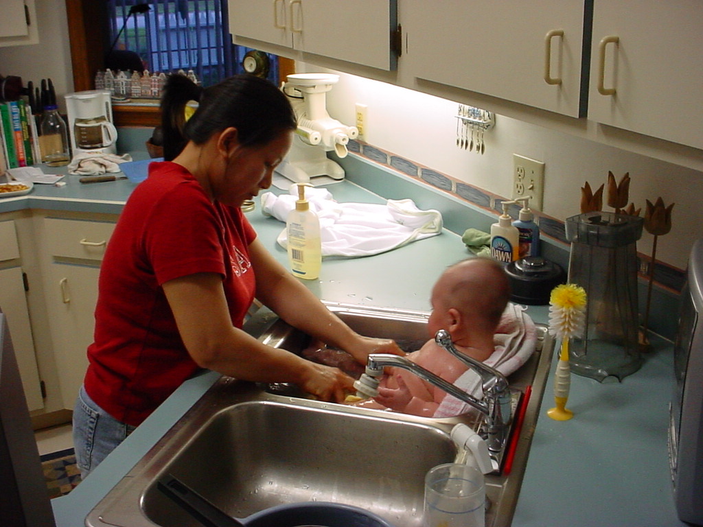 Mommy's Note (September 23, 2005): It has been a great change of pace to be home with Brit full time. In just the past two weeks, we noticed quite a few developmental changes in him. He has been drooling a lot and biting on everything he can fit into his mouth. He started rolling over from his back to his stomach. I also noticed he is starting to recognize me and starts to look for me when I'm out of sight. Brit has been an awesome baby so far. He is now sleeping through the night, more or less (he sleeps for 8-12 hours but is not consistent yet). We really enjoy the little guy and his many, many changes. Let's hope he stays nice and sweet for the trip out to California next month. His gung-gung and popo are excited to see the little guy again. They have not seen him since he was a month old. Once again, we had a good visit at his well baby check-up. Brit is growing at a good clip (ranking in the 90th plus percentiles for height and weight). But he is not the biggest baby around town. We started attending a mom's luncheon every Tuesday at Manatee Memorial Hospital where he was born. There are some big babies in that group. Brit enjoys hanging out with his buddies. His mommy likes to talk to other new mommies. The mom's luncheon is a great place to meet other first time moms and compare notes.