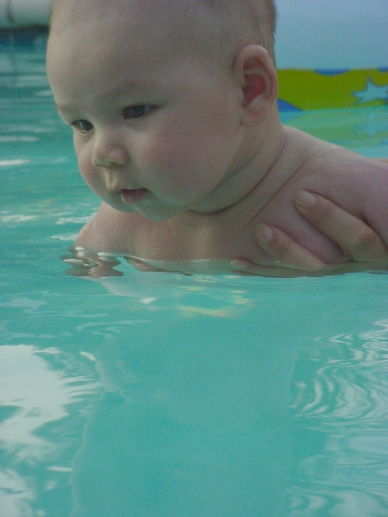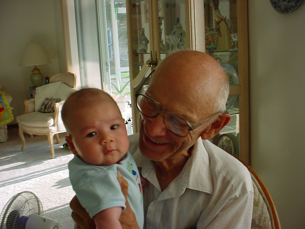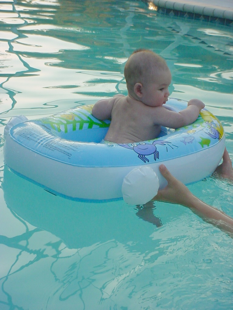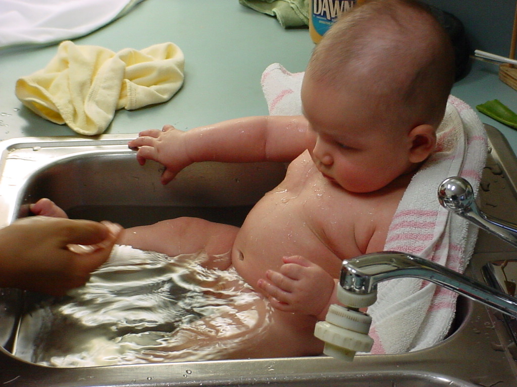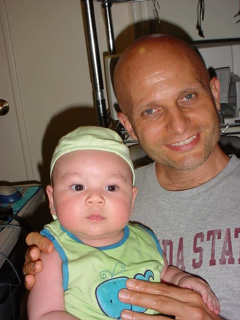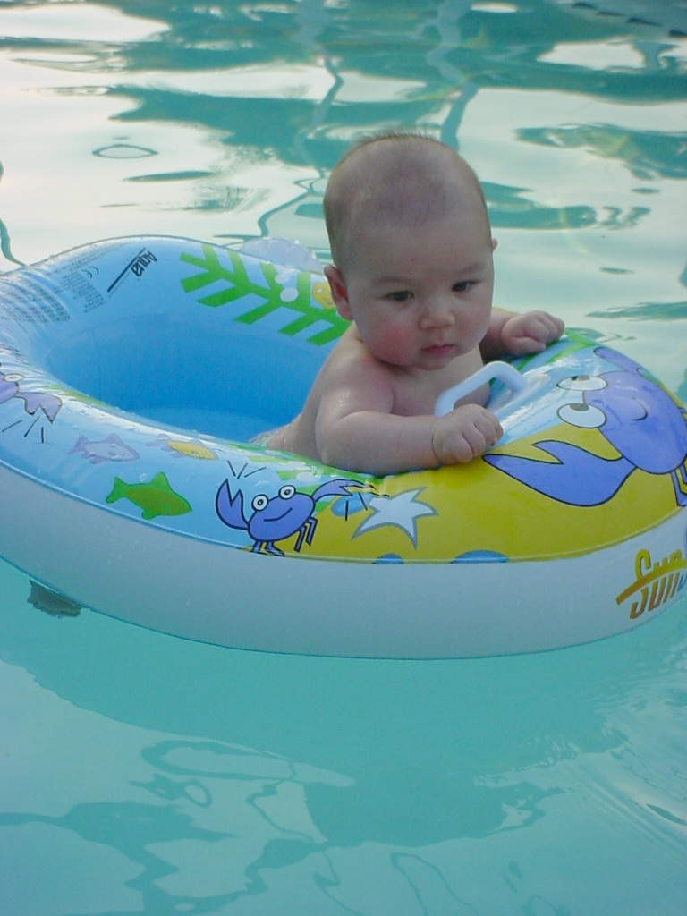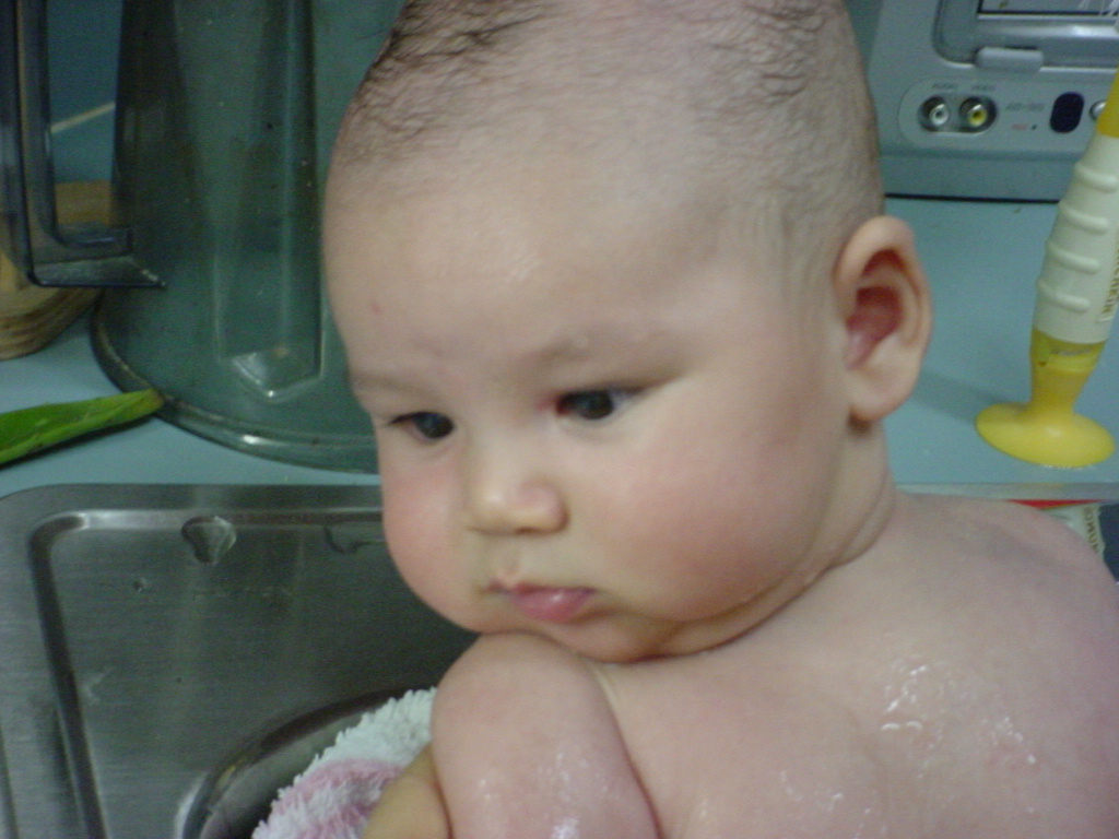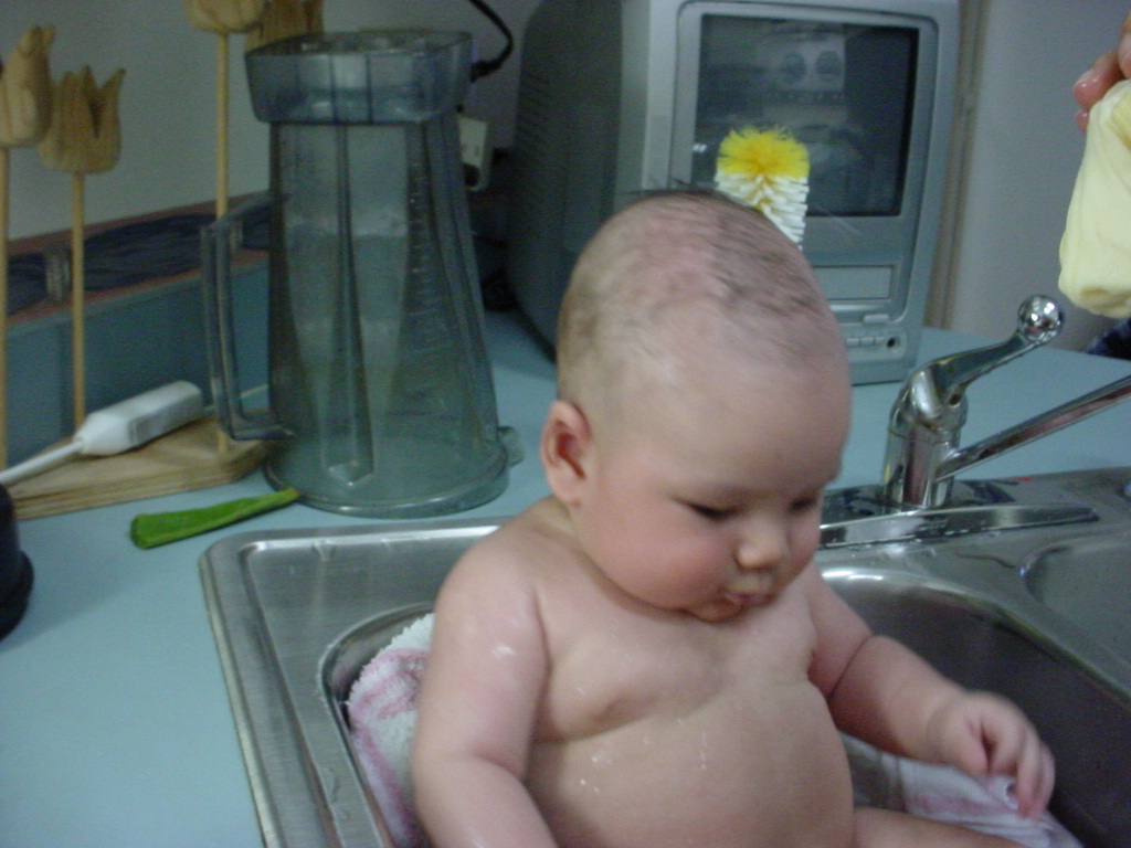 Mommy's Note (September 23, 2005): It has been a great change of pace to be home with Brit full time. In just the past two weeks, we noticed quite a few developmental changes in him. He has been drooling a lot and biting on everything he can fit into his mouth. He started rolling over from his back to his stomach. I also noticed he is starting to recognize me and starts to look for me when I'm out of sight. Brit has been an awesome baby so far. He is now sleeping through the night, more or less (he sleeps for 8-12 hours but is not consistent yet). We really enjoy the little guy and his many, many changes. Let's hope he stays nice and sweet for the trip out to California next month. His gung-gung and popo are excited to see the little guy again. They have not seen him since he was a month old. Once again, we had a good visit at his well baby check-up. Brit is growing at a good clip (ranking in the 90th plus percentiles for height and weight). But he is not the biggest baby around town. We started attending a mom's luncheon every Tuesday at Manatee Memorial Hospital where he was born. There are some big babies in that group. Brit enjoys hanging out with his buddies. His mommy likes to talk to other new mommies. The mom's luncheon is a great place to meet other first time moms and compare notes.