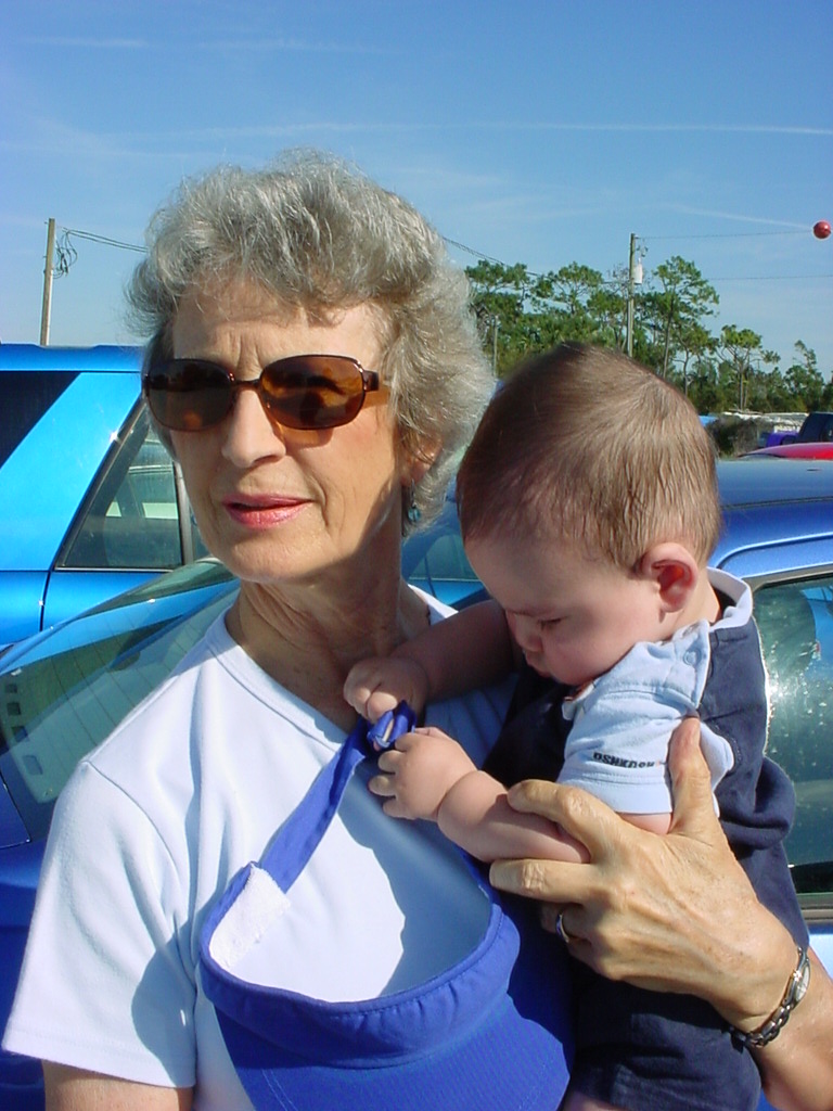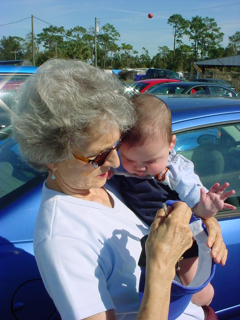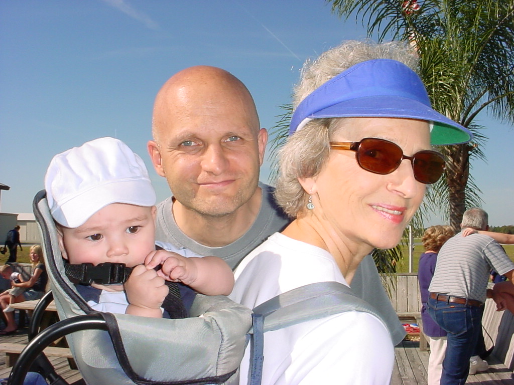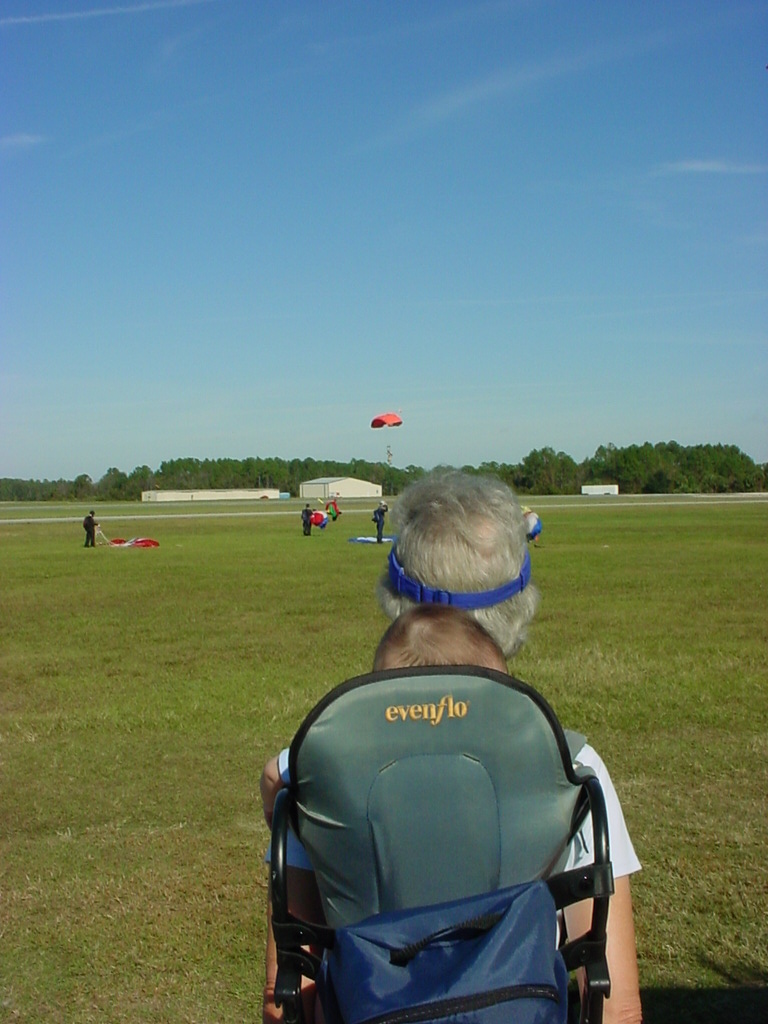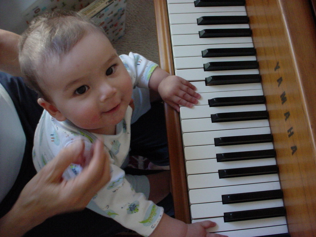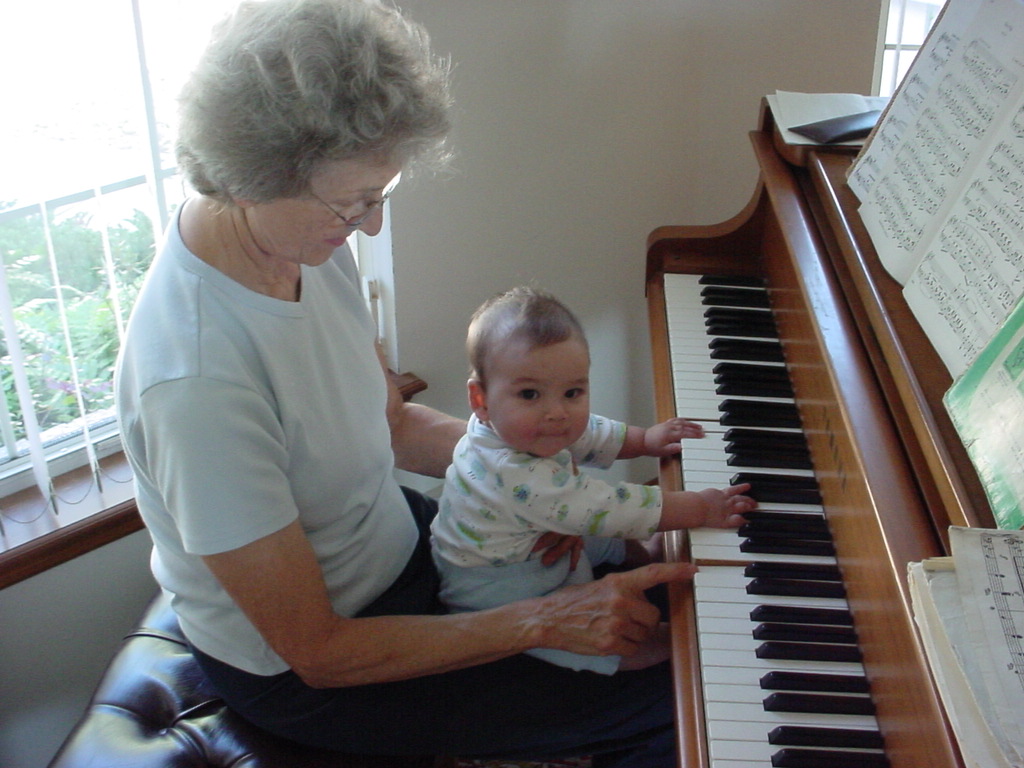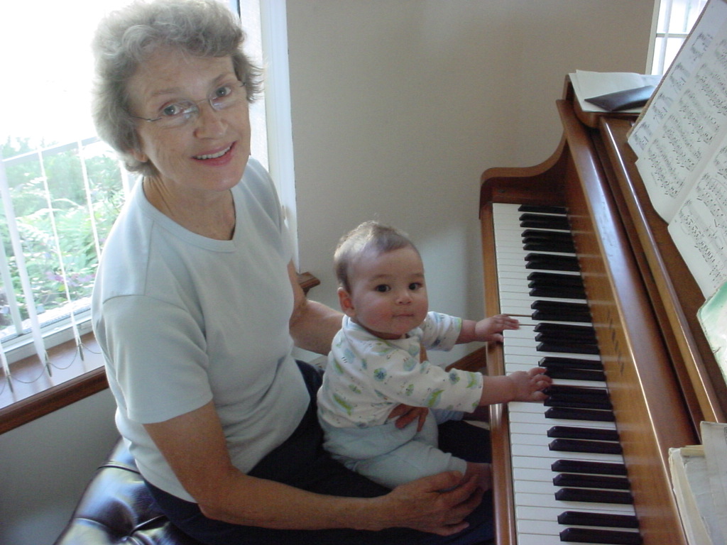 First Thanksgiving Mom's Note November 23,2005: Brit's first Thanksgiving weekend was spent in Deland where his Oma and Opa live. He really enjoyed going to the Deland Dive School to watch the skydivers jump out of the planes. Oma gave him his first piano lesson. You can see he likes pounding on the keys.