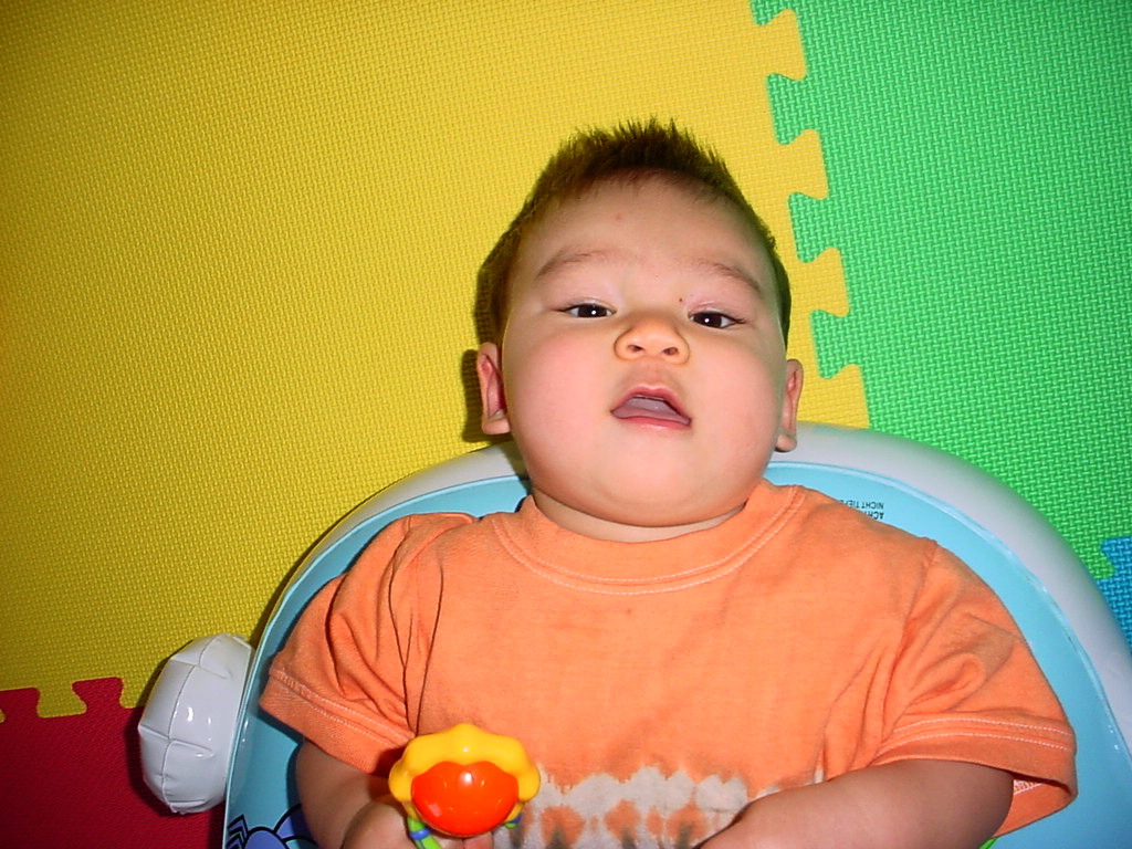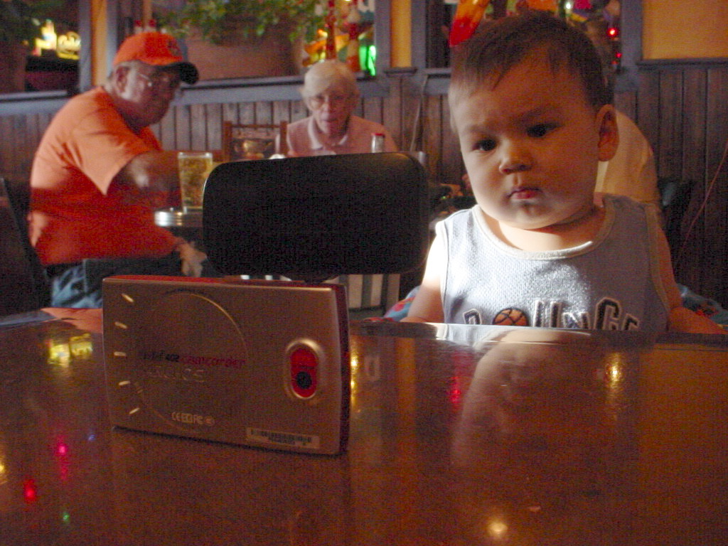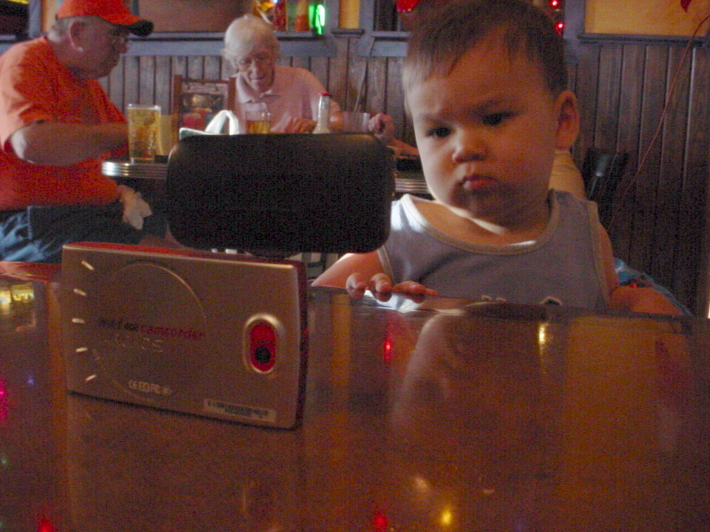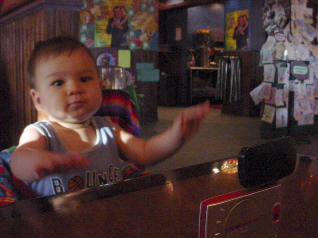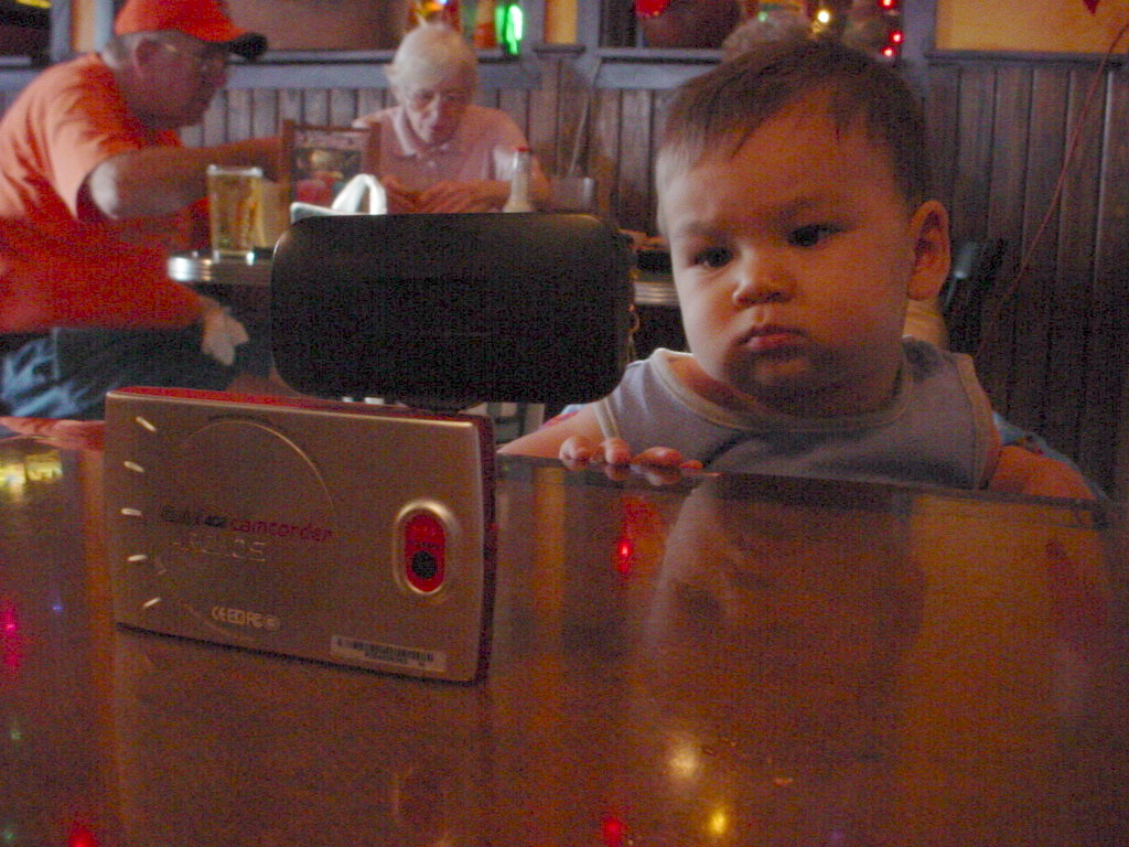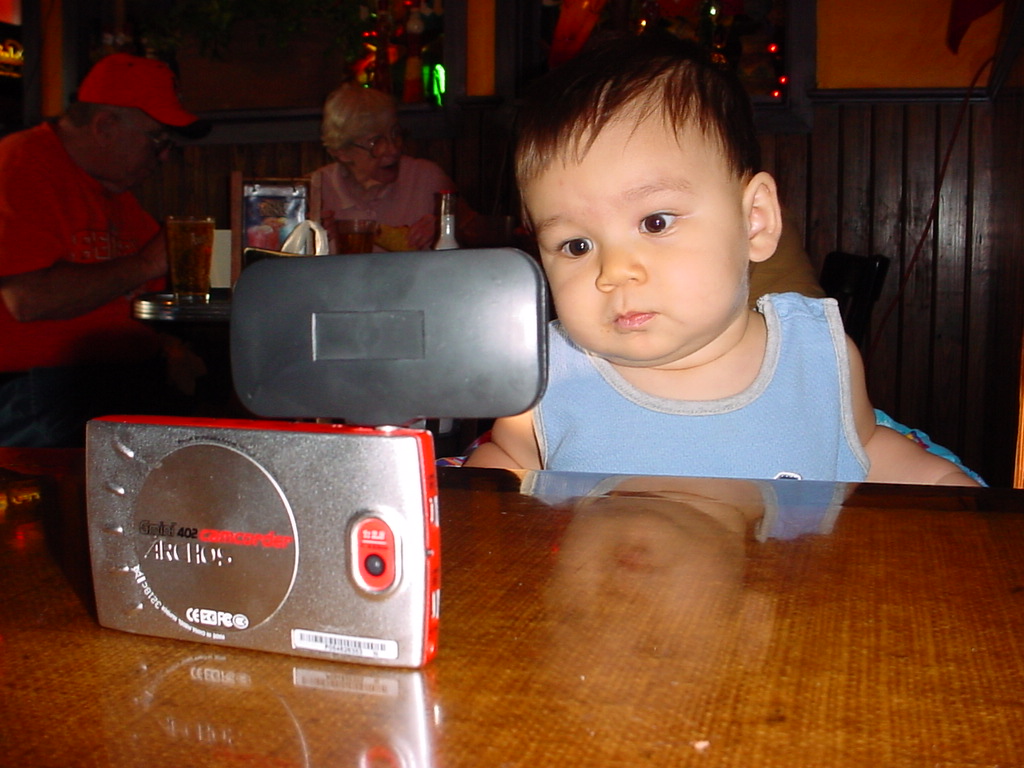 | Daddy's Note (March 25, 2006): Brit turned 10 months old on the 22nd. It seems like just yesterday that we got a positive pregnancy test. Okay, maybe it was... ;-). But seriously, we got a new gadget, the Archos Gmini 402 Camcorder and Video Player. I've added a video below, hosted by a great service called YouTube, and made with the Gmini. It's way cool! Anyways here Brit is watching his Baby Einstien. You can see the people in the background looking, too. He stays nice and mesmerized while we eat. Isn't technology great? |